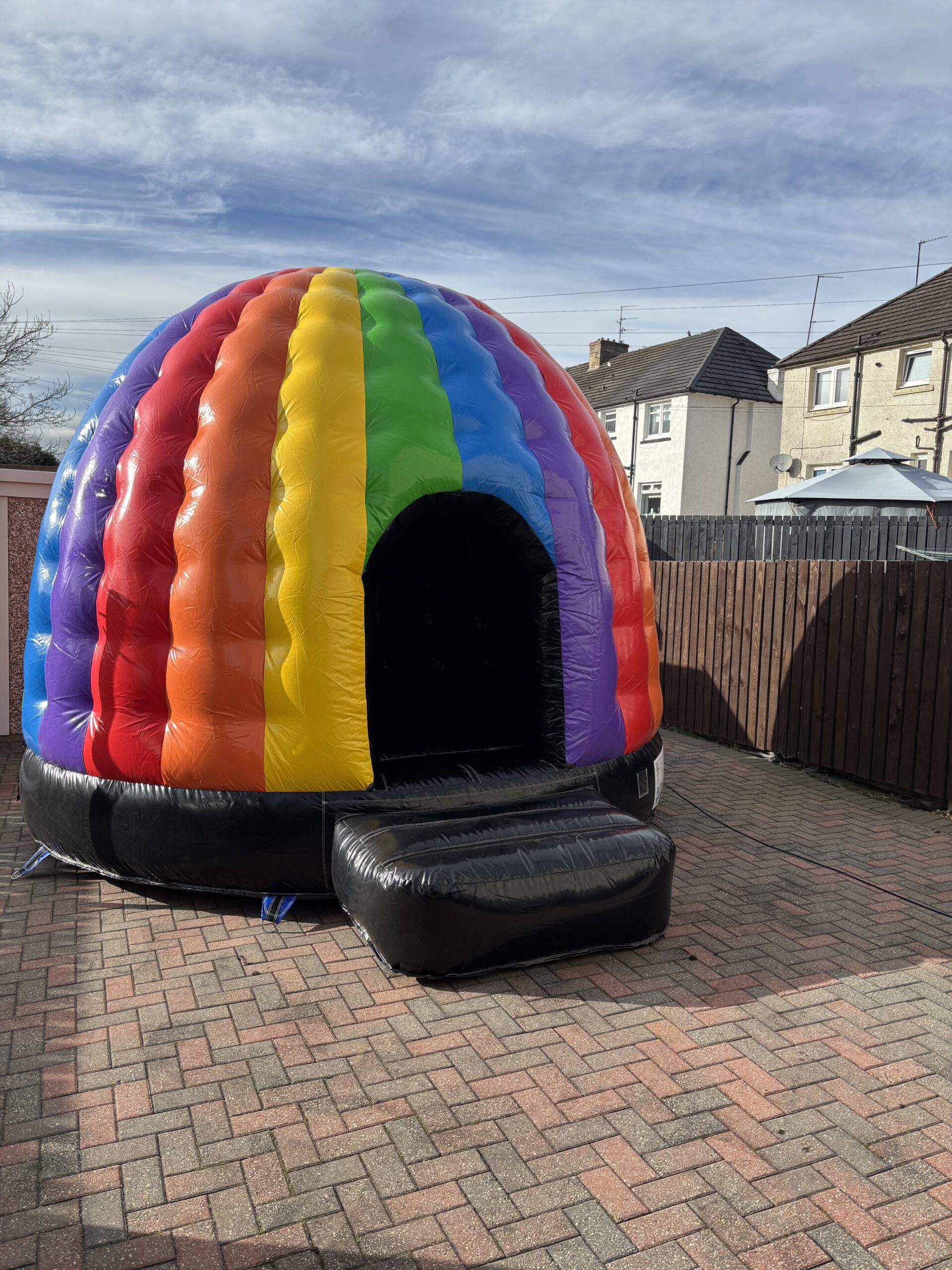 Disco Domes our black dome is 12ft high 12ft wide,so would need 14ft to fit safely and 17ft long comes with light and Bluetooth speaker multi coloured dome is 16ft high and 20ft wide comes with light and Bluetooth speaker